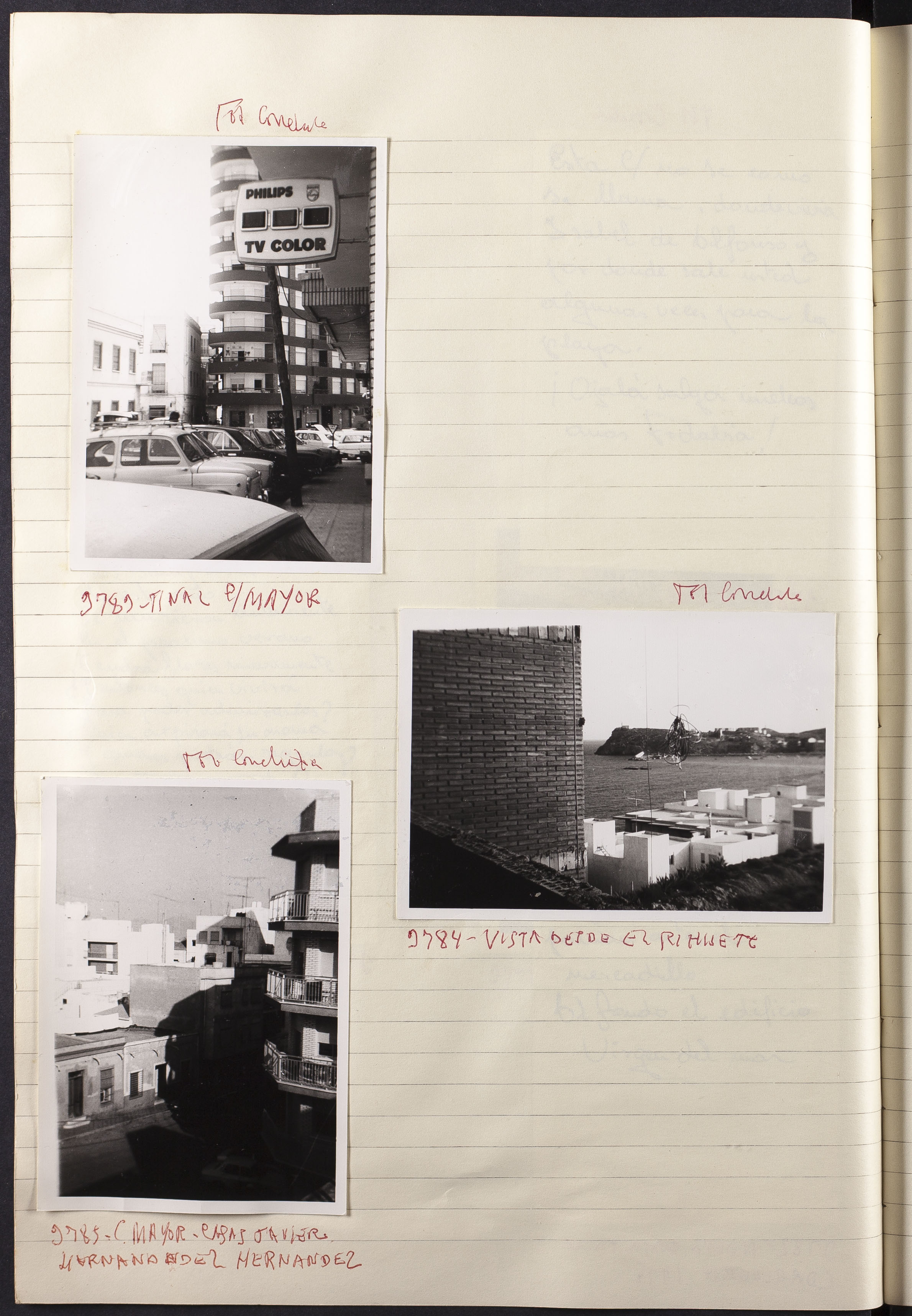 Papel con información manuscrita a bolígrafo tamaño 22 x31 cm. Incluye fotografías monocromas en diferentes tamaños que se especifican en el Alcance y contenido.