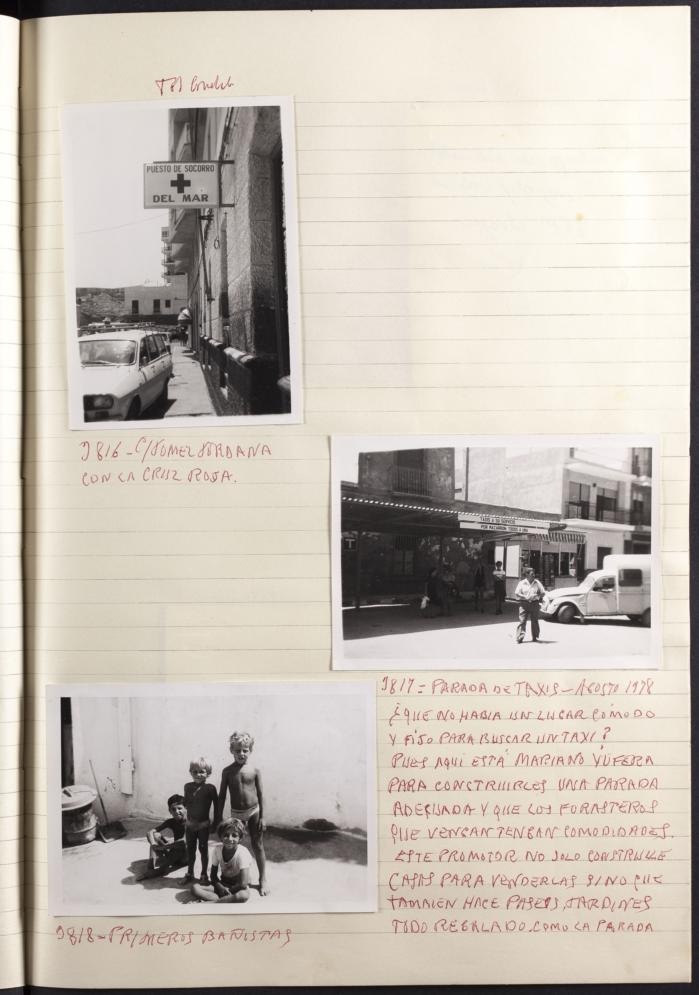 Papel con información manuscrita a bolígrafo tamaño 22 x31 cm. Incluye fotografías monocromas en diferentes tamaños que se especifican en el Alcance y contenido.