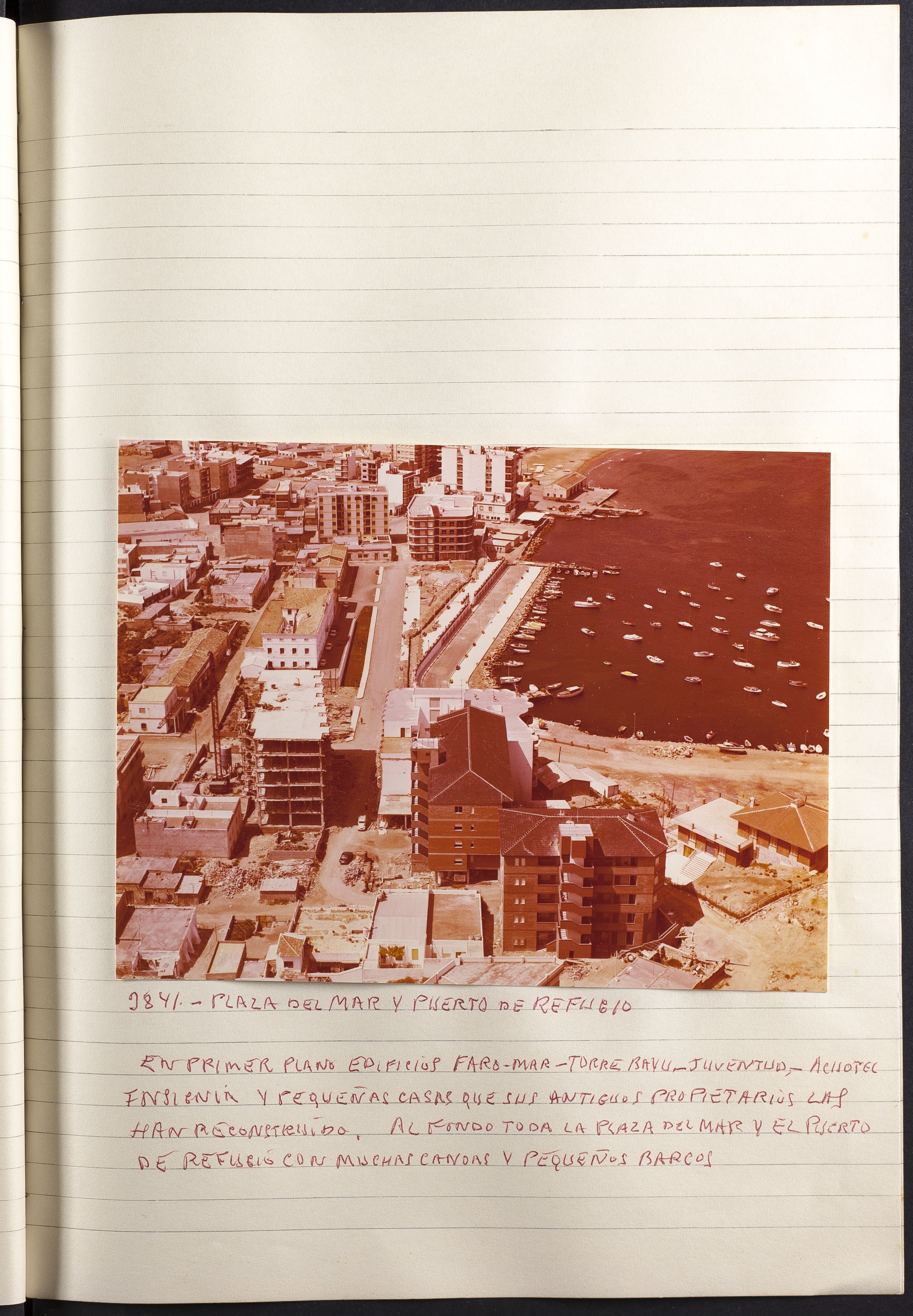 EN PRIMER PLANO EDIFICIOS FARO-MAR-TORREBAYU-JUVENTUD-ACUOTEL INSIGNIA Y PEQUEÑAS CASAS QUE SUS ANTIGUOS PROPIETARIOS LAS HAN RECONSTRUIDO. AL FONDO TODA LA PLAZA DEL MAR Y EL PUERTO DE REFUGIO CON MUCHAS CANOAS Y PEQUEÑOS BARCOS.