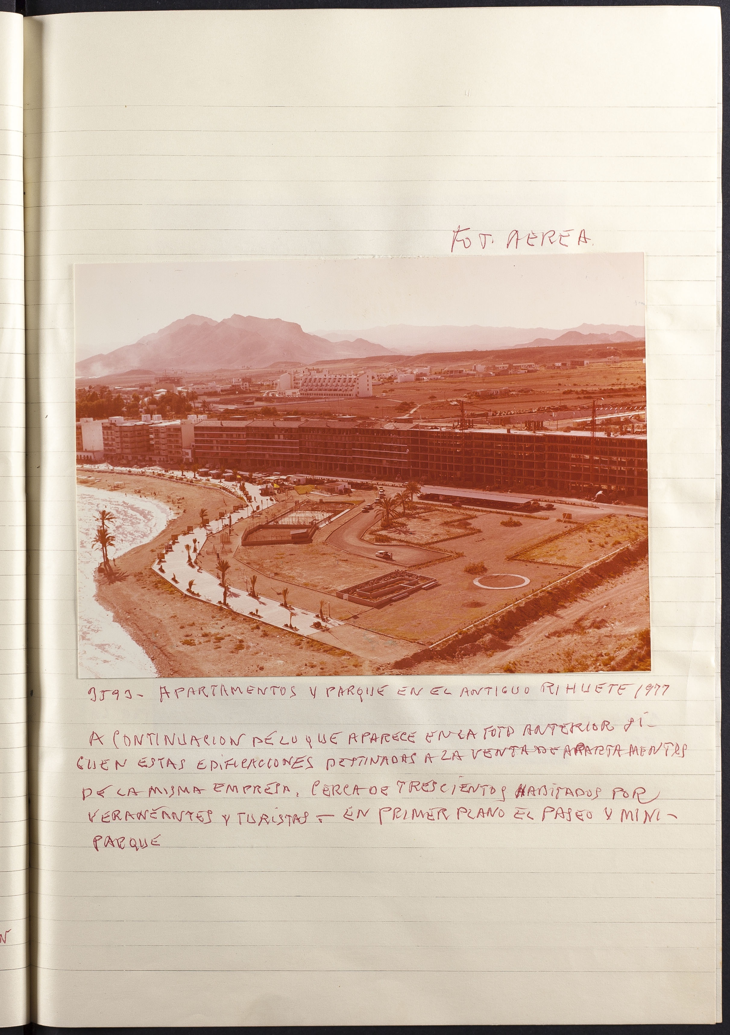 Fotografía 3593: APARTAMENTOS Y PARQUE EN EL ANTIGUO RIHUETE 1977. Figura escrito a mano el origen de la fotografía: Fot. Aérea. Dimensiones: 12,5 x 17,5 cm