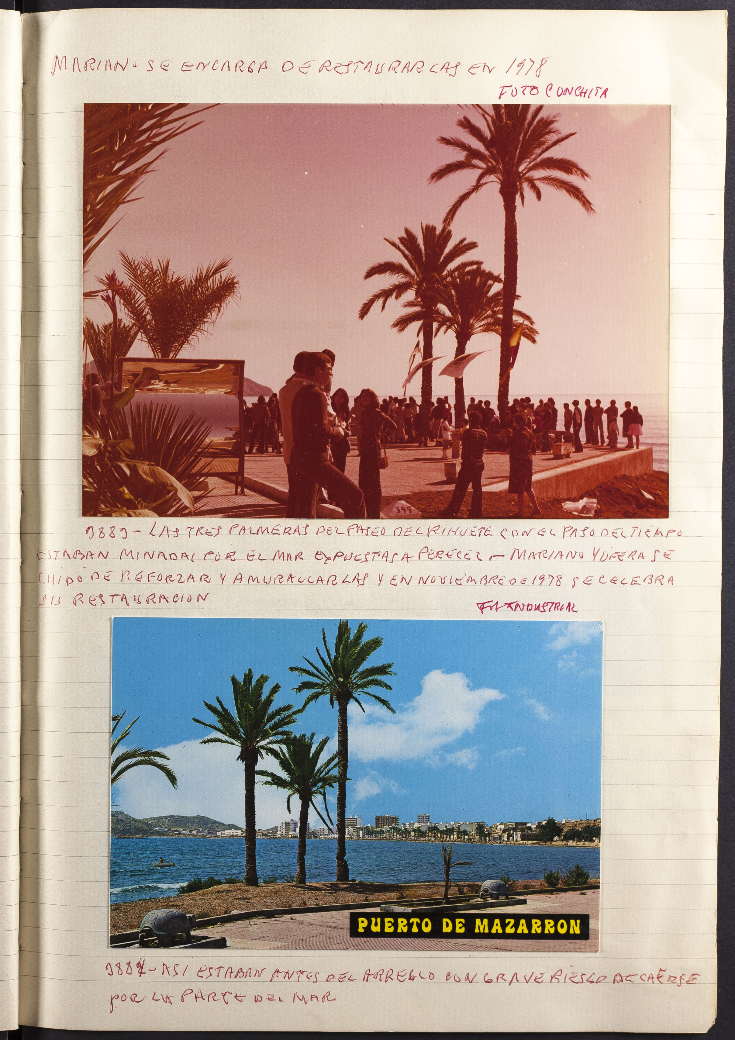 Fotografía 3883: LAS TRES PALMERAS DEL PASEO DEL RIHUETE CON EL PASO DEL TIEMPO ESTABAN MINADAS POR EL MAR EXPUESTAS A PERECER - MARIANO YÚFERA SE DESCUIDÓ DE REFORZAR Y AMURALLARLAS Y EN NOVIEMBRE DE 1978 SE CELEBRA SU RESTAURACIÓN. Figura escrito a mano el origen de la fotografía: Foto Conchita. Dimensiones: 12,5 x 17,5 cm