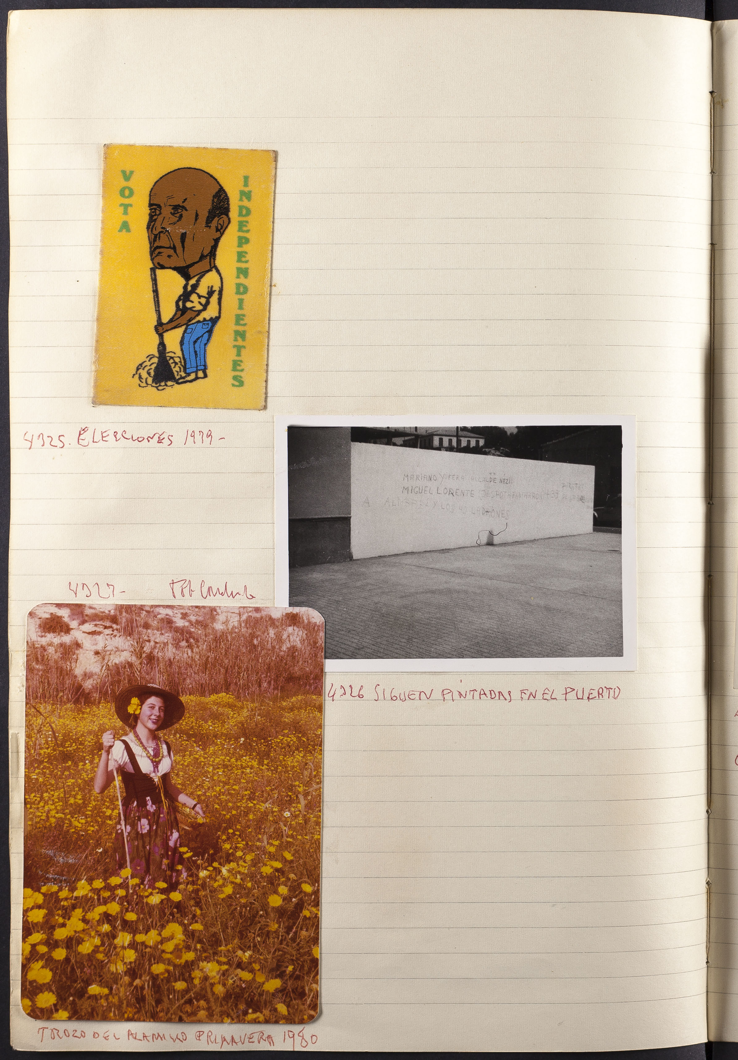 Papel con información manuscrita a bolígrafo tamaño 22 x31 cm. Incluye fotografías policromas y monocromas en diferentes tamaños que se especifican en el Alcance y contenido.