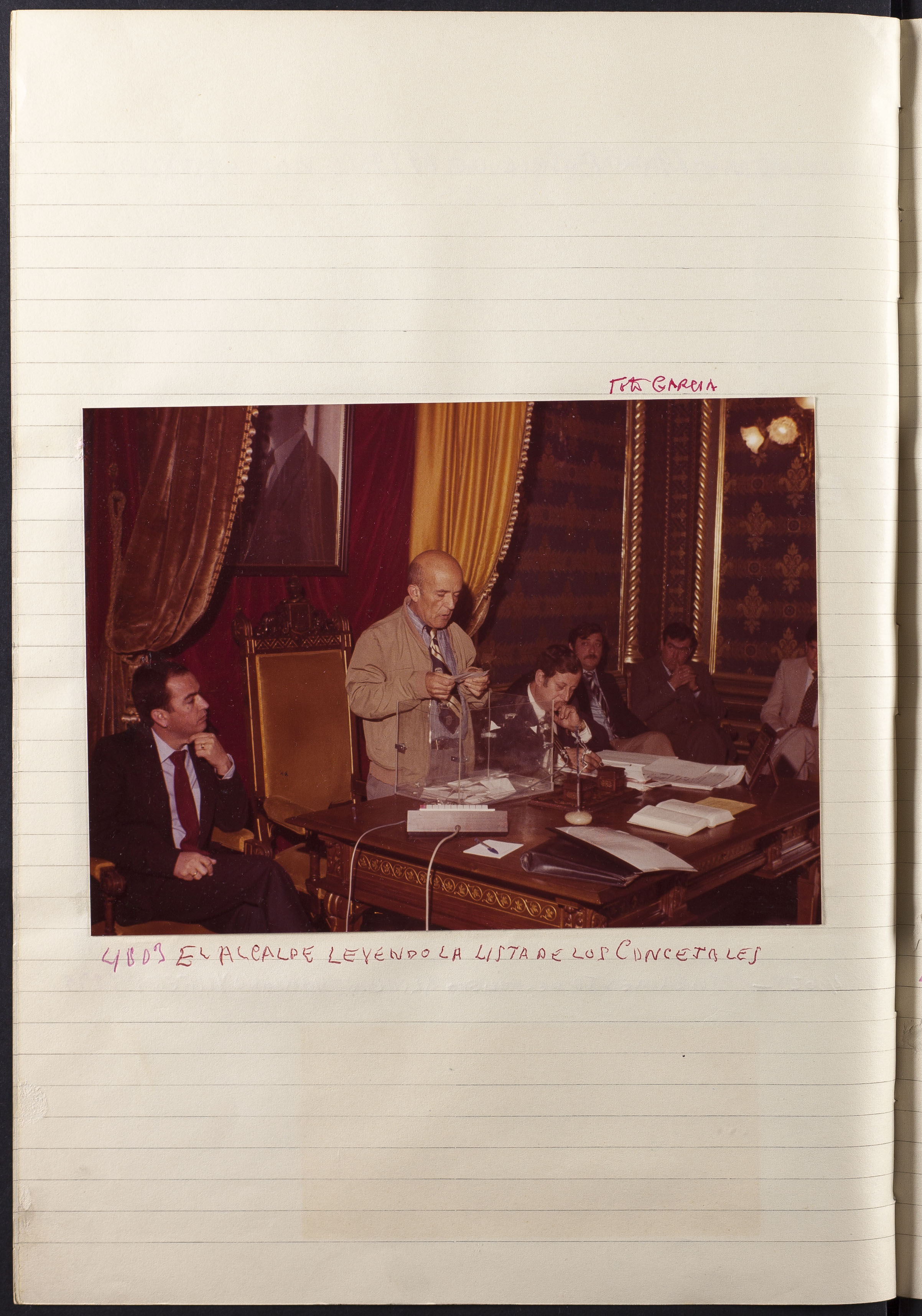 Fotografía 4003: EL ALCALDE LEYENDO LA LISTA DE LOS CONCEJALES. Figura escrito a mano el origen de la fotografía: Fot. García. Dimensiones: 13 x 17,5 cm