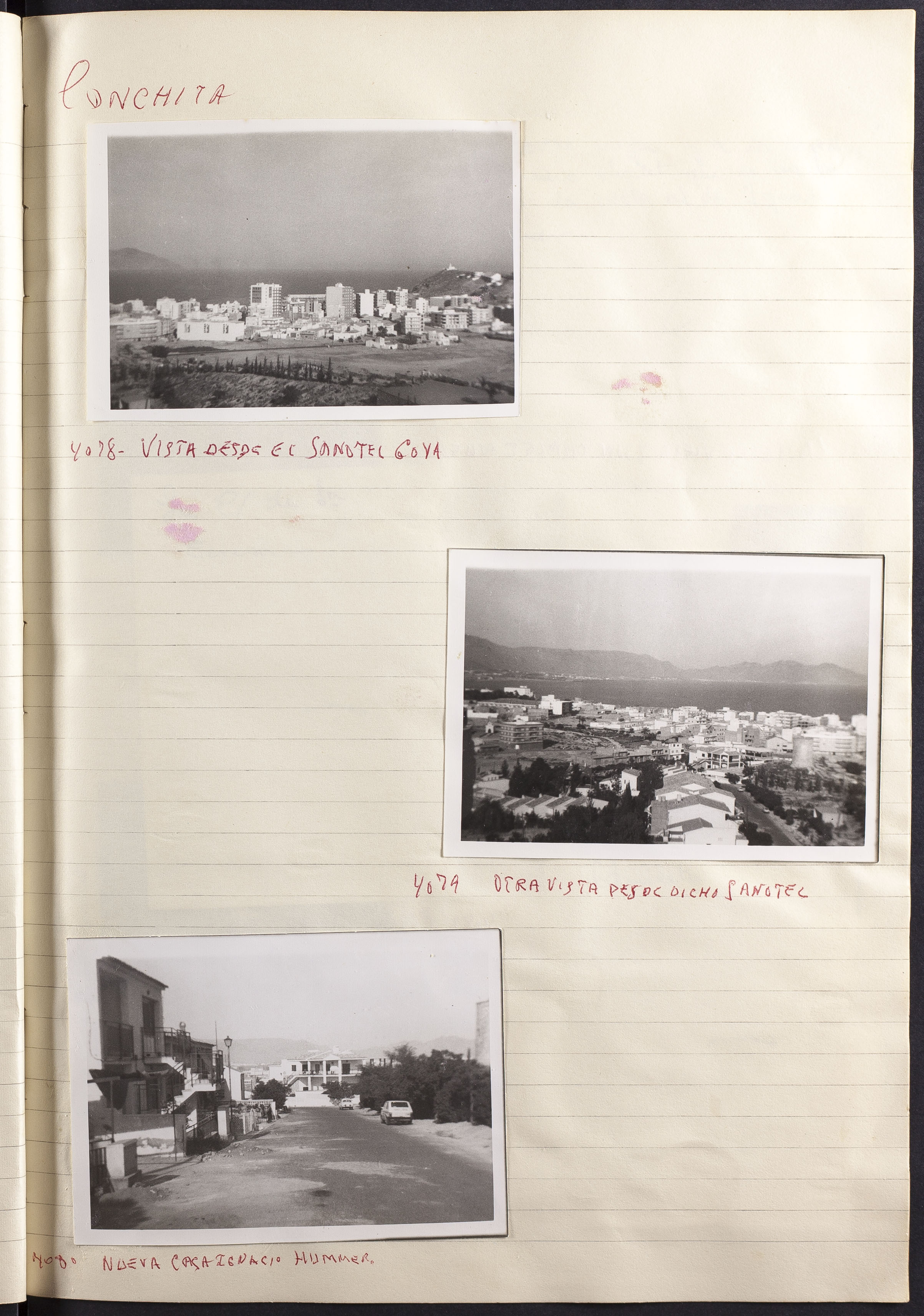 Papel con información manuscrita a bolígrafo tamaño 22 x31 cm. Incluye fotografías monocromas en diferentes tamaños que se especifican en el Alcance y contenido.