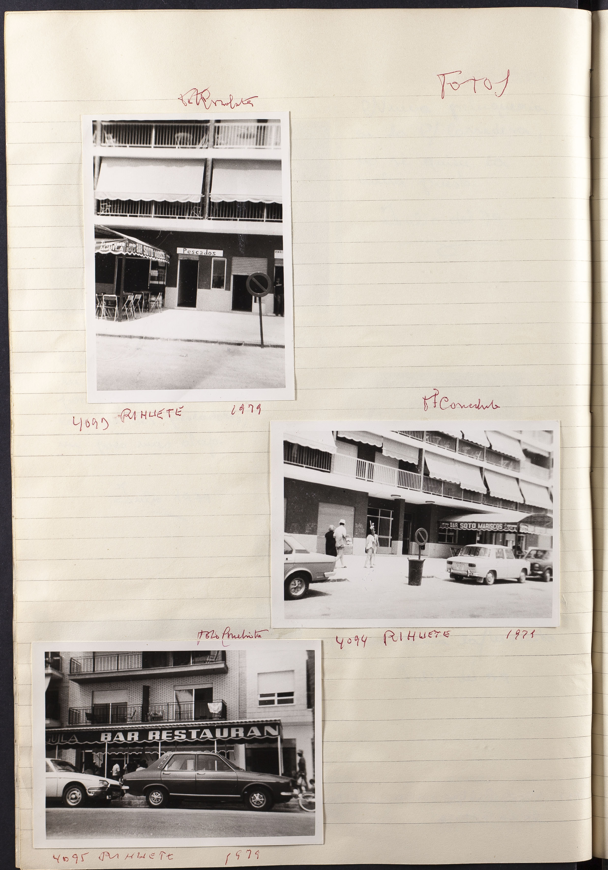 Papel con información manuscrita a bolígrafo tamaño 22 x31 cm. Incluye fotografías monocromas en diferentes tamaños que se especifican en el Alcance y contenido.