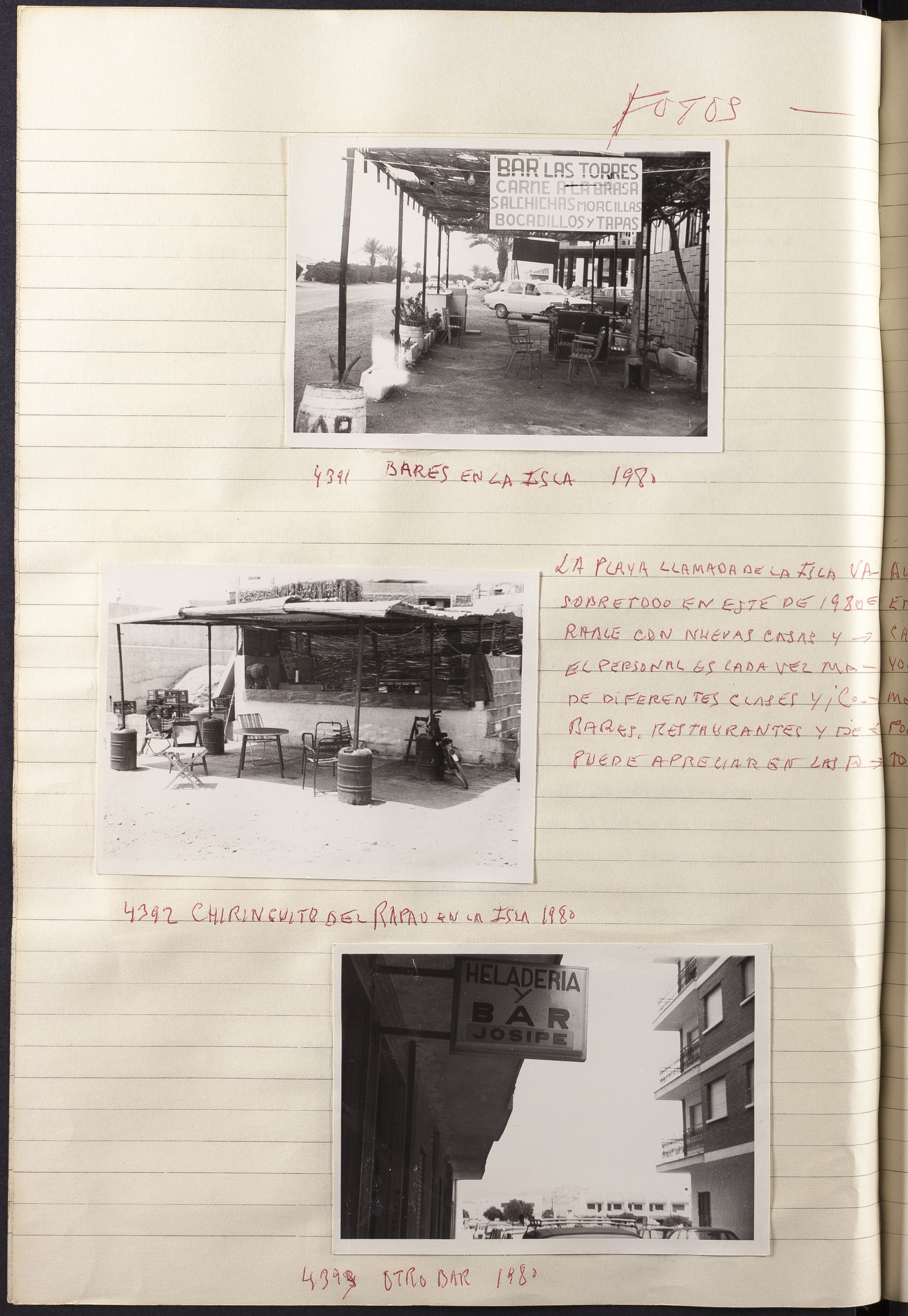Papel con información manuscrita a bolígrafo tamaño 22 x31 cm. Incluye fotografías monocromas en diferentes tamaños que se especifican en el Alcance y contenido